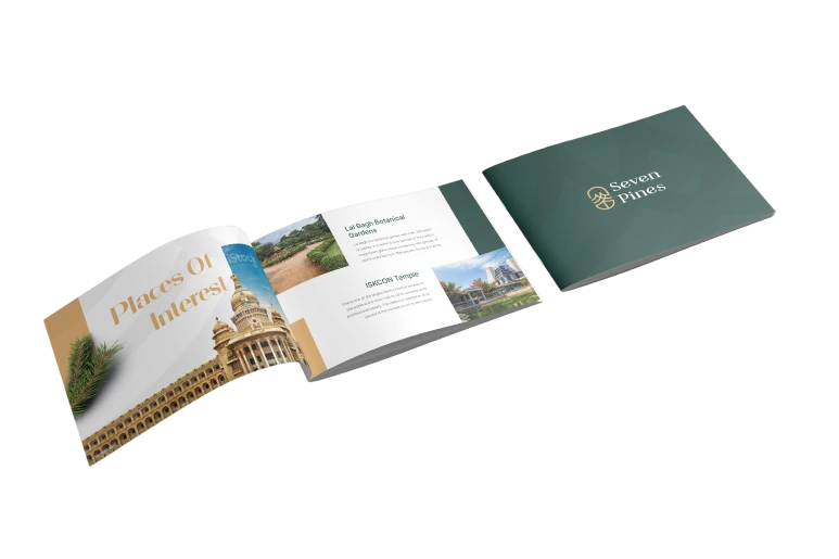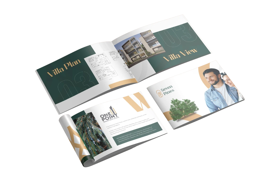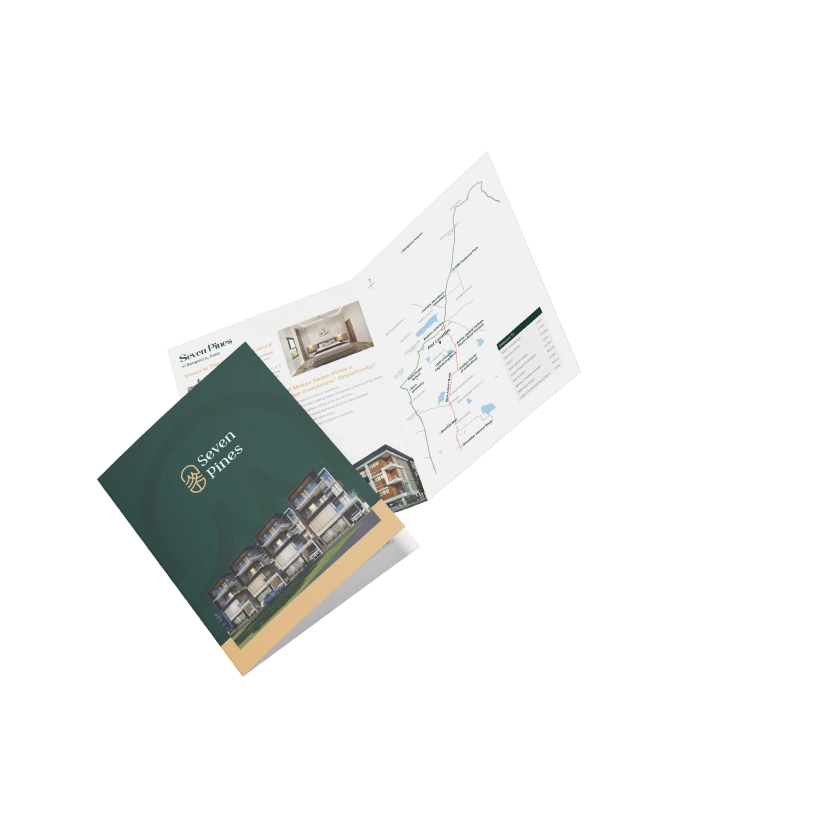 Brochure Design – A modern, luxury brochure was created to showcase Seven Pines’ offerings, combining elegant visuals, structured layouts, and high-quality typography.