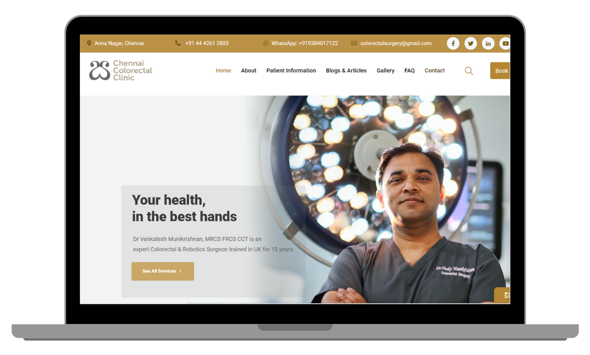 The brainchild of Dr Venkatesh Munikrishnan, Consultant Colorectal & Robotic Surgeon, Chennai Colorectal Clinic is one-of-kind super-specialist centre for all problems related to the colon, rectum and anus. CCC required a brand new website where patients could learn more about colorectal diseases, book appointments and receive proper treatment.
